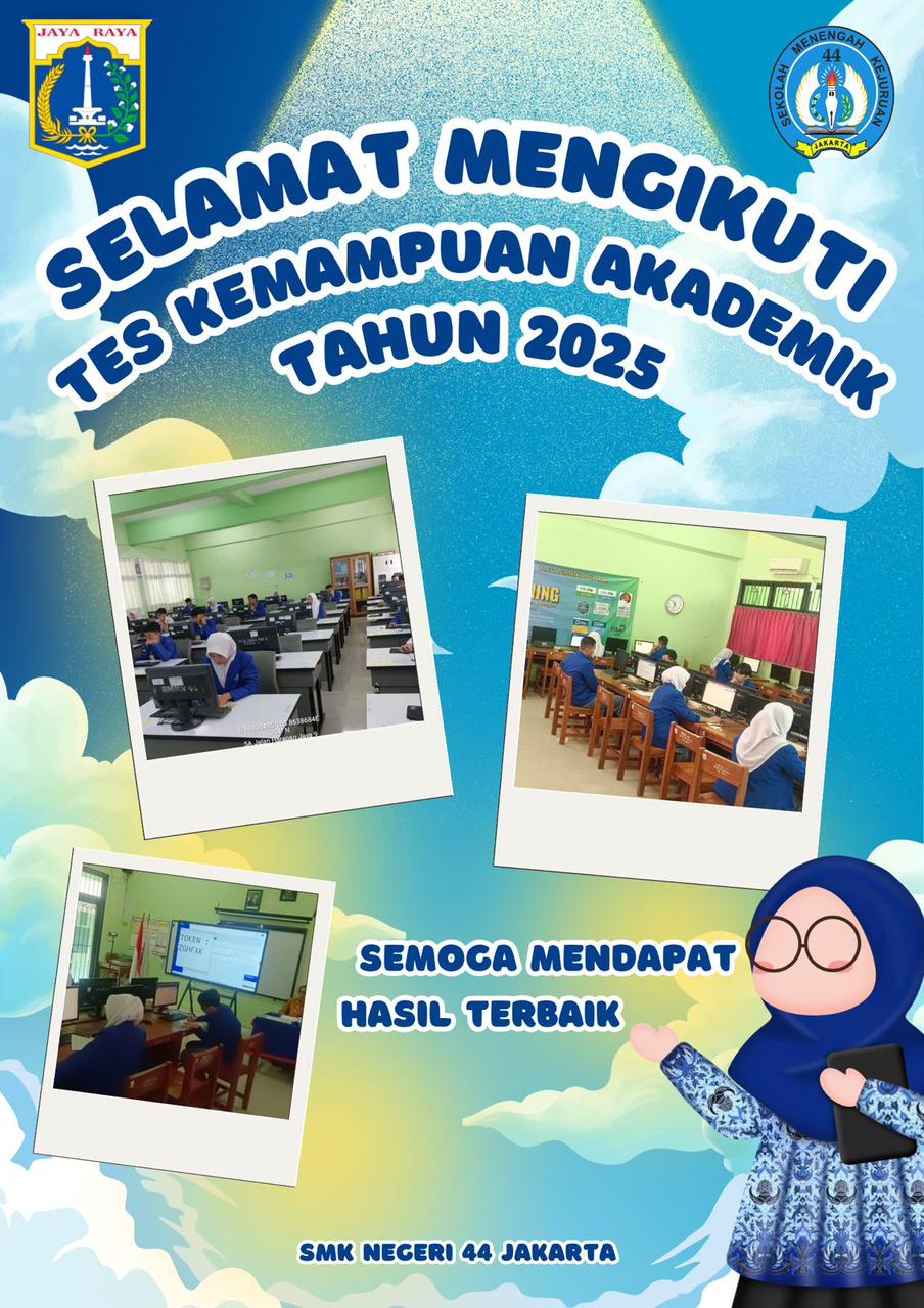 Seluruh murid SMKN 44 Jakarta di tahun 2025/2026 melaksanakan Tes Kemampuan Akademik ( TKA) dengan tema “Berprestasi itu penting, namun jujur jauh lebih utama,” yang bertujuan untuk mengukur kemampuan dan capaian akademik berdasarkan penilaian terstandar sehingga dapat digunakan untuk berbagai kepentingan . Tes ini mencakup lima mata pelajaran utama: Bahasa Indonesia, Bahasa Inggris, Matematika, PKN dan Projek Kreatif Kewirausahaan.